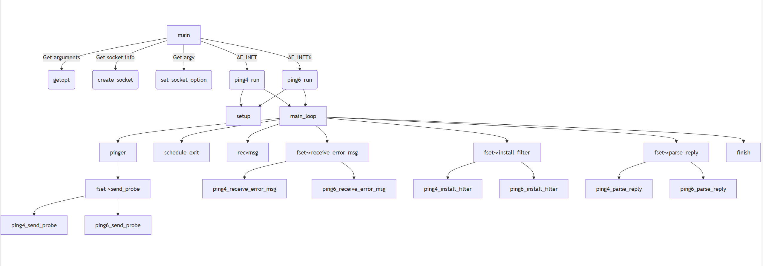 ping.c实现了ping工具中对于ipv4和ipv6的通用处理入口,包括创建socket的create_socket, 主入口函数main。关于ipv4的主入口ping4_run,收发包处理ping4_receive_error_msg, ping4_parse_reply, ping4_send_probe, ping4_install_filter也实现在ping.c中。